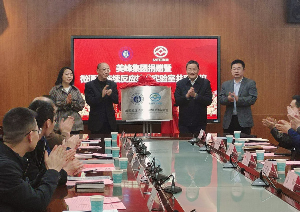 随后,黄石美丰化工有限责任公司总经理尹光校友、校长雷儒金、黄石汉微科技有限公司总经理向亚琴校友、betway西汉姆联官网院长殷国栋共同为微通道连续反应技术实验室揭牌。