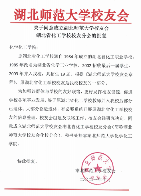 原湖北省化学工业学校是隶属原湖北省石化厅的一所全日制省级重点中专,1984年首次招生,2002年招收最后一届学生,2003年并入我校。根据《湖北师范大学校友会章程》,原湖北化校校友是我校校友的一部分。湖北化校撤销建制、整体并入湖北师大已20年,原教职工分布学校各学院、部门,由于历史原因档案信息不全。原湖北化校培养了多少校友?如何提高化校校友的认同感、归属感?学院经过多方调研听取意见,并报校友会批准,决定成立湖北师范大学校友会湖北省化学工业学校校友分会,秘书处挂靠betway西汉姆联官网。