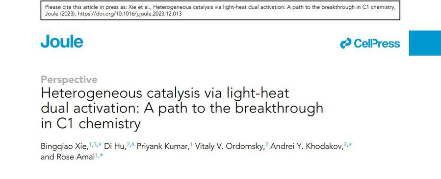 近日,我院胡迪博士与瑞士洛桑联邦理工学院谢冰桥博士、法国里尔大学Andrei Khodakov主任研究员团队、澳大利亚新南威尔士大学Rose Amal教授团队合作,在国际著名学术期刊Joule上发表光热耦合催化小分子(主要是C1分子)活化与转化前瞻性文章。