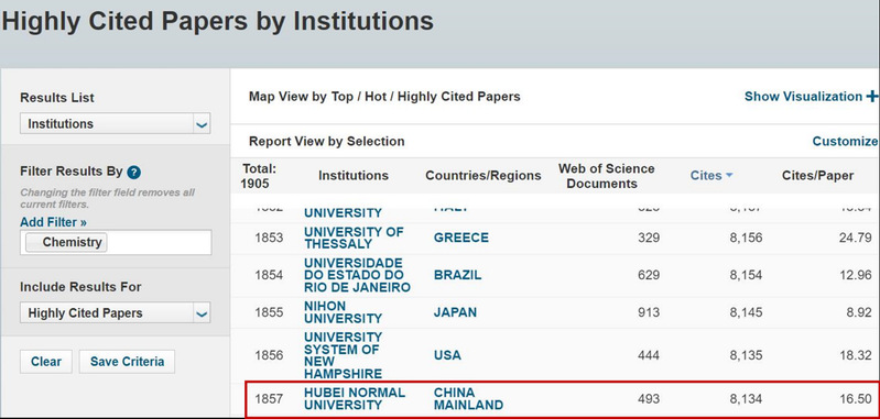 最新数据显示,全球共有1905个机构进入了ESI化学学科前1%,我院化学学科排位第1857位,中国大陆地区第291位。本期ESI数据统计时间为2014年1月1日至2024年2月29日,我院化学学科共有WOS论文493篇,总被引8134次,篇均被引16.50次,高被引论文14篇,单篇最高被引560次。