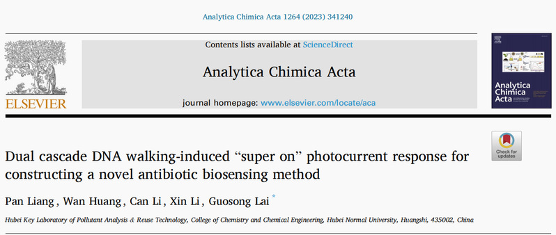 光电化学生物传感器已在分析科学领域中广泛用于各种目标物分析方法的构建,然而如何结合相关光电活性材料构建其性能优异的信号转导策略目前仍然面临重要挑战。该研究设计了一种双重级联DNA步行放大策略,并将其与制备的纳米电极平台的可控性能调控相结合,成功发展了一种基于目标物特异性核酸适配体识别引发“super on”光电流响应的光电化学生物传感新方法。将其用于卡那霉素抗生素分析,该方法可在五个数量级浓度范围内实现其方便高灵敏检测,检测限低至0.53 fg·mL−1。该成果于2023年4月份发表于中科院SCI一区期刊Analytica Chimica Acta(IF:6.2),2021级硕士研究生梁盼为第一作者,赖国松教授为通讯作者,湖北师范大学为该论文唯一通讯单位。