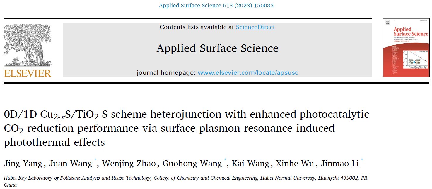 [成果3] 表面等离子体共振效应0D/1D Cu2-xS/TiO2 S型异质结光热协同催化CO2还原