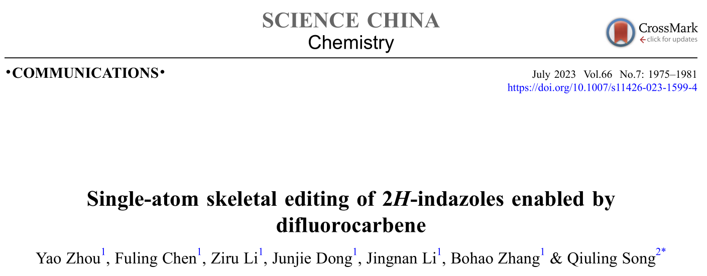 有机分子的后期修饰可以大大增加分子的结构多样性,长期以来,C-H键官能团化是生物活性分子后期修饰的常用手段,可以为药物分子的筛选提供多样的先导化合物。相比于C-H键官能团化的后期修饰,直接对芳香杂环或碳骨架进行特定原子的消除和插入极具挑战性。二氟卡宾作为缺电子的活泼中间体,其直接参与碳环及杂环的分子骨架编辑尚无成功的案例。基于此,该研究利用溴二氟乙酸乙酯作为二氟卡宾的来源,实现了2H-吲唑化合物N-N键断裂的扩环反应,在温和的条件下实现了吲唑化合物的分子骨架编辑。该成果于2023年5月发表于中科院SCI大类一区、综合性化学学术期刊Science China Chemistry(IF:9.6),周耀副教授为论文第一作者,福州大学宋秋玲教授为通讯作者,湖北师范大学为论文第一通讯单位。