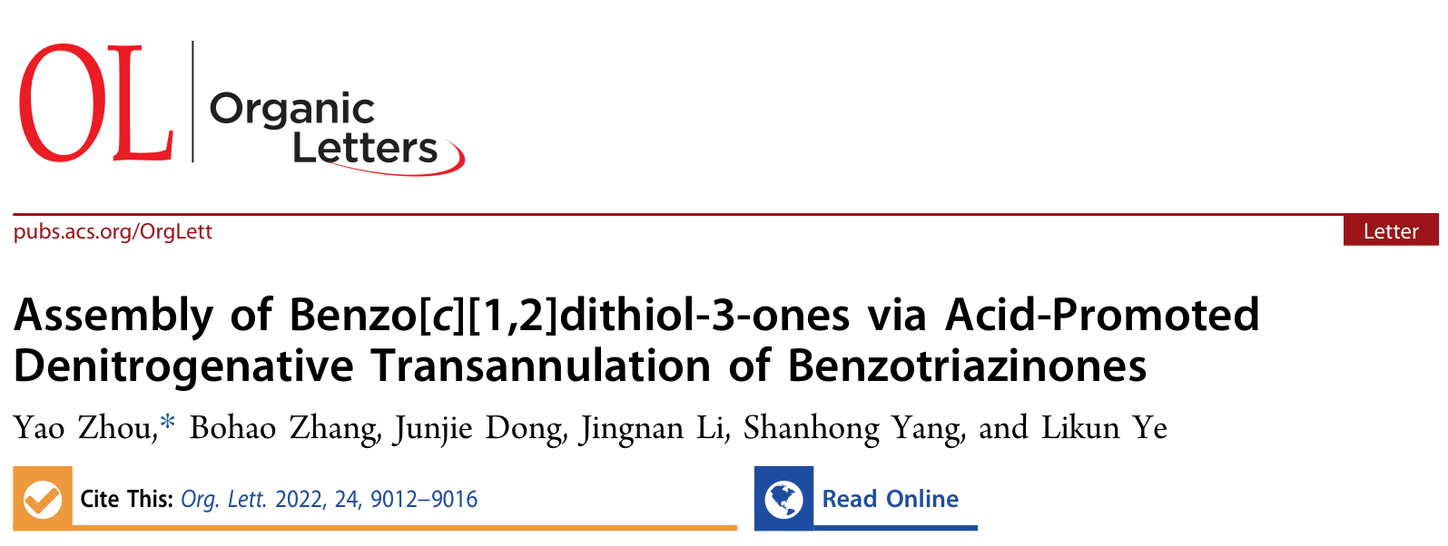 氮杂环的脱氮环化反应可以为复杂药物分子及天然产物的合成提供了强大的合成策略。目前苯并三嗪酮的活化主要依赖于过渡金属催化,无金属催化苯并三嗪酮的脱氮气反应极其罕见,简单的酸或碱促进苯并三秦酮的脱氮气开环反应仍然有待开发。基于此,该研究开发了乙酸促进苯并三嗪酮的“断裂-脱除-环化”反应。相比于链状对称或非对称的二硫化合物,环状二硫化合物的构建仍然具有一定的合成挑战性。该研究在无过渡金属的条件下,实现了环状S-S键的形成,为苯并二磺酚酮的构建提供了全新的合成路线。该成果于2022年12月发表于中科院SCI大类一区、自然指数期刊Organic Letters(IF:5.2),周耀副教授为论文第一作者及通讯作者,湖北师范大学为论文唯一通讯单位。