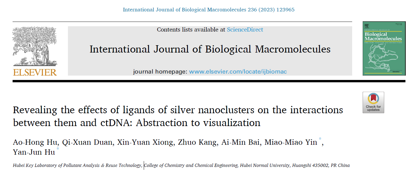 银纳米团簇在生物医药领域被广泛应用。DNA是遗传信息的载体。银纳米团簇是否会影响DNA的结构和性质?该研究采用多种方法,从宏观到微观研究了谷胱甘肽和二氢硫辛酸修饰的银纳米团簇与小牛胸腺DNA的相互作用,揭示了表面配体对银纳米团簇与DNA相互作用的影响机制和规律。该成果于2023年3月发表于中科院SCI大类一区期刊International Journal of Biological Macromolecules(IF:8.2),2020级硕士研究生胡傲虹为第一作者,尹苗苗博士和胡艳军教授为共同通讯作者,湖北师范大学为该论文唯一通讯单位。