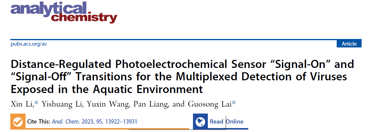 如何完成PEC传感器单识别界面上多重目标物的高通量与高灵敏检测,一直以来是PEC传感技术在环境分析领域应用的瓶颈问题。该研究发展了一种刺激介导的距离调控型PEC传感器,以pH介导的距离调控模式,动态诱导传感器表面的光电子转移,实现PEC传感器单识别界面上“signal-off”与“signal-on”双检测模式的自由切换,完成水环境暴露的Norovirus与Rotavirus核酸的多元检测,巧妙解决了PEC传感器单识别界面上多重检测信号输出的问题,拓展了PEC传感技术在环境分析领域的应用。该成果于2023年9月发表于中科院SCI大类一区、自然指数期刊Analytical Chemistry(IF:7.4),李新副教授为论文第一作者及通讯作者,赖国松教授为共同通讯作者,湖北师范大学为唯一通讯单位。