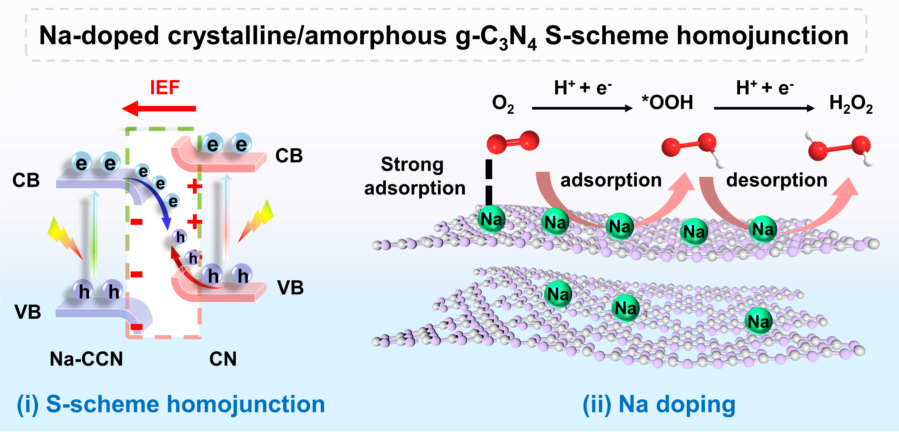 该研究基于一种创新的Na2CO3诱导结晶调控策略,成功实现钠掺杂结晶/非晶g-C3N4 S型同质结光催化剂的一步制备。采用该方法所合成的光催化剂在过氧化氢合成中表现出优异的催化性能,最优生成速率达444.6 μmol·L-1·h-1,是传统g-C3N4材料的6.1倍。通过多种材料表征手段与理论计算分析表明,S型同质结结构有效促进了光生电荷的空间分离与传输效率;同时,钠离子掺杂优化了O2吸附与*OOH等关键反应中间体的转化路径,显著提升了H2O2的界面生成动力学。二者的协同作用推动了该催化剂性能的显著增强。本研究为开发高性能光催化剂提供了新思路,在太阳能燃料合成及光催化应用领域展现出广阔前景。
