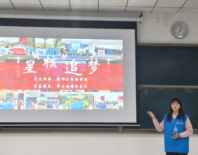 11月12日晚,在人文大楼21AT05教室举办中国共产党人精神谱系之“两弹一星”精神专题学习。院团委负责人郭先哲、星“核”追梦宣讲团成员代表及全体团校学员参加。活动在《青春》的暖场视频中拉开序幕,宣讲团负责人王宇欣首先介绍了暑期社会实践开展情况;全体成员共同观看了纪录片《我们走在大路上》第五集《壮志凌云》;随后,宣讲团成员金萧宇、姚雨晴分别作《党领导下的中国核工业》和《国家名片:华龙一号》主题宣讲。最后,郭先哲围绕“两弹一星”精神的内涵作总结讲话。他指出,“热爱祖国、无私奉献”是这一精神的灵魂,体现在老一辈科学家毅然归国、隐姓埋名的报国情怀中;“自力更生、艰苦奋斗”是其核心,彰显了在极端困难条件下攻坚克难的坚定意志;“大力协同、勇于登攀”则是其鲜明特征,展现了依靠集体智慧实现科技跨越的协同精神。立足化学化工学科特色,他向团员青年提出要坚定理想信念,将个人发展融入国家需要;要刻苦钻研专业,练就服务国家战略的过硬本领。