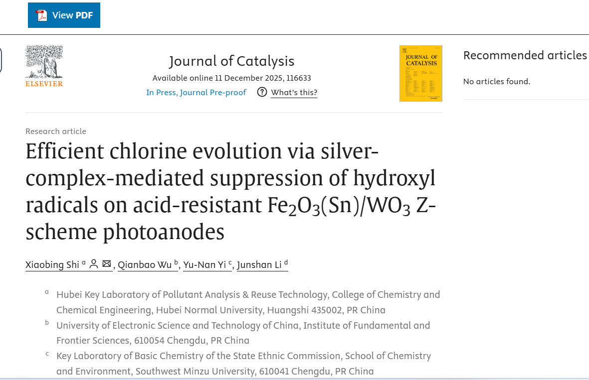 近日,Journal of Catalysis在线发表了我院化工教研室石小兵博士的最新研究成果。论文题目为“Efficient Chlorine Evolution via Silver-Complex-Mediated Suppression of Hydroxyl Radicals on Acid-Resistant Fe2O3(Sn)/WO3 Z-Scheme Photoanodes”(利用银配合物介导抑制羟基自由基在耐酸Fe2O3(Sn)/WO3 Z型光阳极上实现高效析氯)。石小兵博士为论文第一作者兼通讯作者,湖北师范大学为论文唯一通讯单位。Journal of Catalysis是Elsevier出版社1962年起发行的国际期刊,主要报道有催化方面的最新研究进展,是中科院一区top期刊,最新影响因子为6.5。