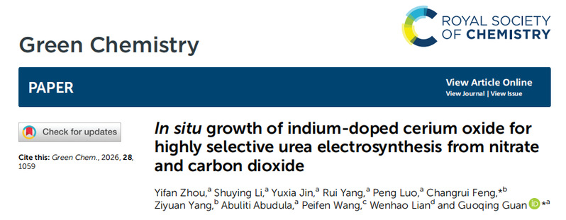 近日,分析化学教研室冯长瑞博士在国际知名期刊Green Chemistry(《绿色化学》)上发表电化学尿素合成最新研究成果。论文题为“In situ growth of indium-doped cerium oxide for highly selective urea electrosynthesis from nitrate and carbon dioxide”(原位生长铟掺杂铈氧化物用于硝酸盐和二氧化碳共还原高选择性合成尿素)。冯长瑞博士、日本弘前大学官国清教授为论文共同通讯作者,日本弘前大学周奕帆博士为第一作者,湖北师范大学为论文第二通讯单位。Green Chemistry是由Royal Society of Chemistry(英国皇家化学会)出版的国际知名学术期刊,创刊于1999年,该期刊致力于发表有关开发替代绿色和可持续技术的创新研究,为SCI中科院大类一区期刊,最新影响因子为9.2。