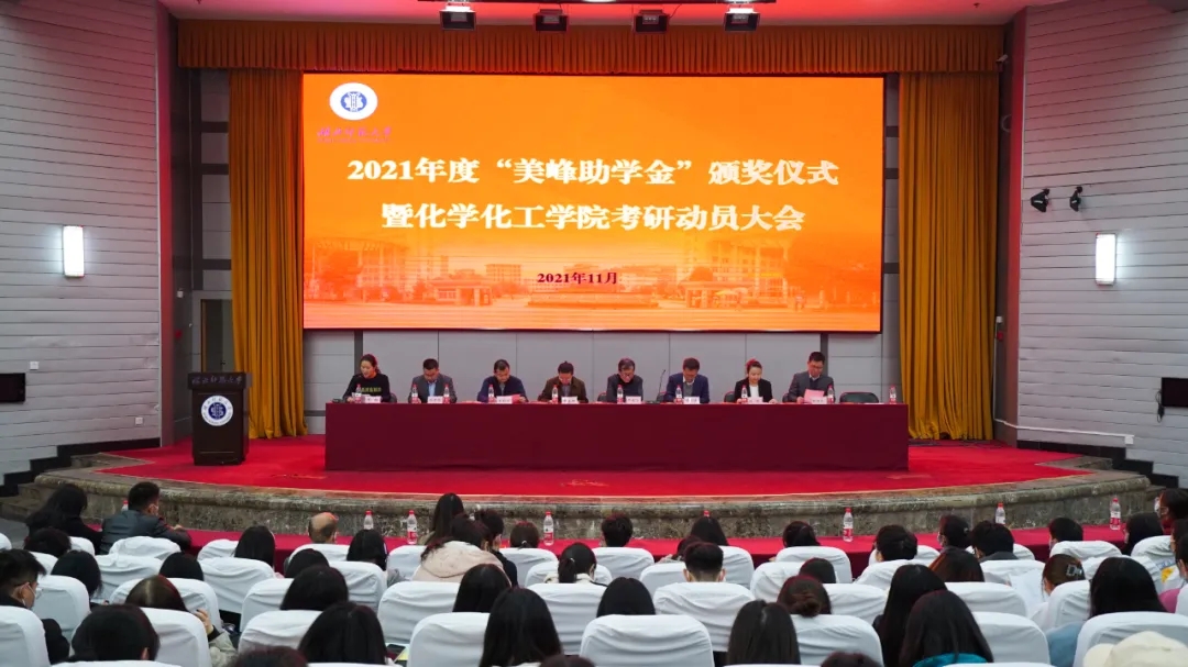 11月18日晚,我院2021年度“美峰助学金”颁奖仪式暨考研动员大会在教育大楼学术报告厅举行。美峰集团美峰化学总经理柯生辉、副总经理童利国,学院党总支书记罗鸿飞、院长胡艳军、副院长赖国松、殷国栋出席并为获得“美峰助学金”的学生颁奖。会议由党总支副书记陈盼主持。