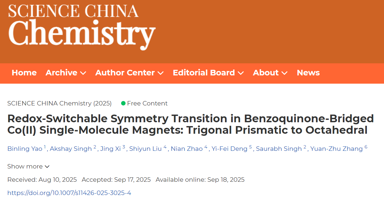 近日,国际知名期刊Science China Chemistry(《科学中国化学》)在线发表了无机化学教研室姚彬玲博士在分子纳米磁体领域的最新研究成果,论文题目为“Redox-Switchable Symmetry Transition in Benzoquinone-Bridged Co(II) Single-Molecule Magnets: Trigonal Prismatic to Octahedral”(《苯醌桥连钴(II)单分子磁体的氧化还原调控对称性转变:三棱柱构型向八面体构型的转换》)。姚彬玲博士为论文第一作者和通讯作者,南方科技大学张元竹教授、印度海得拉巴理工学院Saurabh Singh教授为论文共同通讯作者,湖北师范大学为论文第一通讯单位,Science China Chemistry是Science Press出版社旗下的化学领域期刊,SCI中科院一区TOP期刊,最新影响因子为9.7。
