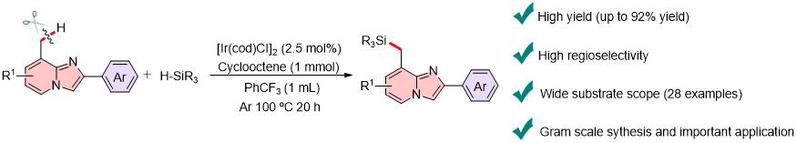 导向C-H键活化凭借其优异的原子经济性和区域选择性,已成为备受关注的合成策略。近年来,咪唑并吡啶作为一种具有特殊结构的“明星”药物分子得到广泛研究,但由于该杂环存在多个活性位点,因此如何实现某个C-H键的精准“切割”成为一个亟需解决的难题。该工作报道了一种铱催化导向C(sp3)-H键活化实现硅基化的方法。该方法利用吡啶和咪唑吡啶作为导向基团,以氢硅烷为硅烷化试剂,可直接实现8-甲基2-芳基咪唑并吡啶甲基的选择性硅基化。该方法无需任何预活化步骤,并以优异的产率获得相应的产品。该反应一个突出的亮点在于克服了反应活性更高的C(sp2)-H键的官能团化干扰,高效实现了更加惰性的C(sp3)-H键硅基化。该合成方案具有良好的可放大性,且适用于多种甲基含氮杂环化合物,在基于系列机理实验研究的基础上提出了一种可能的催化循环机制。