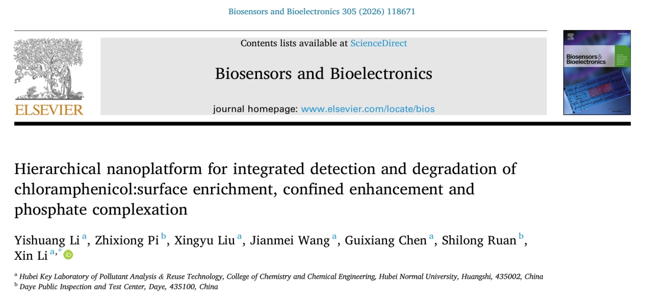 4月,Biosensors and Bioelectronics(《生物传感器和生物电子学》)发表了该团队又一研究成果。论文题为“Hierarchical nanoplatform for integrated detection and detoxification of chloramphenicol:surface enrichment, confined enhancement and phosphate complexation”(表面富集、限域增强与磷酸盐络合的氯霉素检测与降解一体化分级纳米平台)。我院2022级硕士研究生李艺爽为论文第一作者,李新副教授为通讯作者,湖北师范大学为唯一通讯单位。Biosensors and Bioelectronics是ELSEVIER出版社旗下国际知名期刊,SCI中科院大类一区,最新影响因子为10.5。