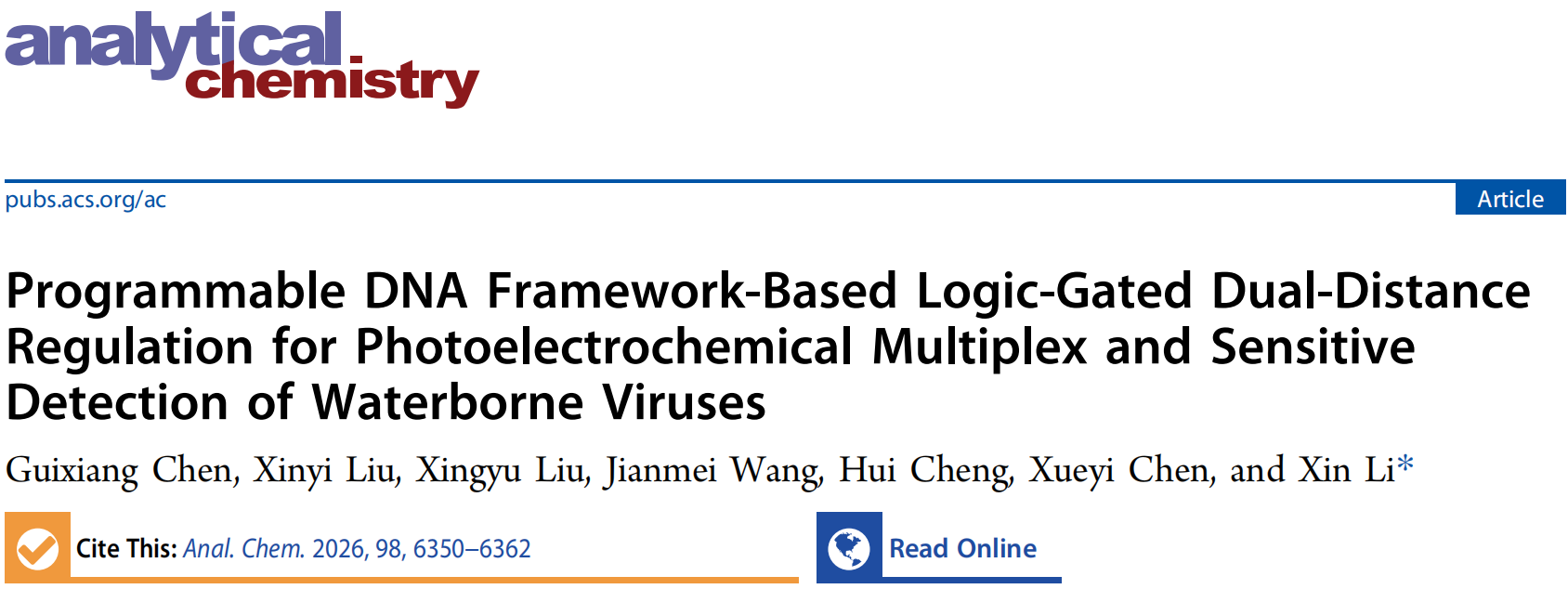2月,Analytical Chemistry(《分析化学》)在线发表该团队题为“Programmable DNA Framework-Based Logic-Gated Dual-Distance Regulation for Photoelectrochemical Multiplex and Sensitive Detection of Waterborne Viruses”(可编程DNA框架逻辑门赋能双重距离调控PEC多元灵敏检测水环境病毒)的研究论文。我院2023级硕士研究生陈桂香为论文第一作者,李新副教授为通讯作者,湖北师范大学为论文唯一通讯单位。Analytical Chemistry是American Chemical Society(美国化学会)出版社旗下收录分析化学领域相关研究成果的顶级期刊,中科院SCI化学大类一区期刊、自然指数期刊,最新影响因子为6.7。